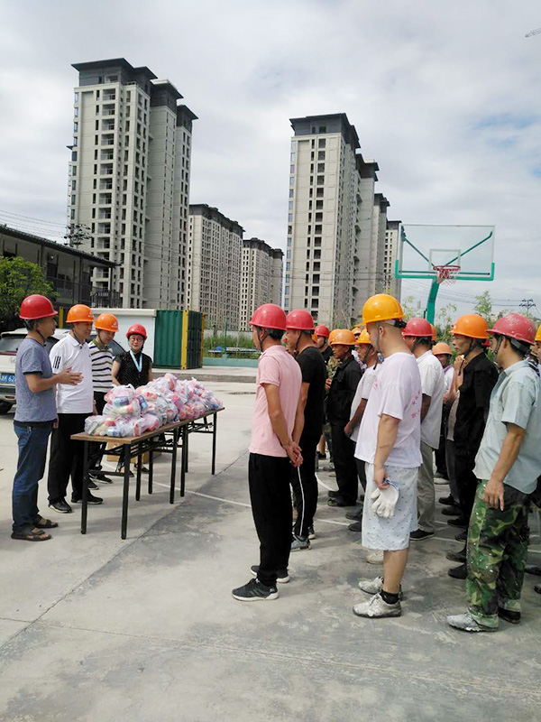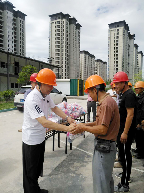8月31日上午,烈日當(dāng)空,驕陽似火。市住房城鄉(xiāng)建設(shè)局副局長蔣金松、法規(guī)處處長呂躍華、施工管理處呂飛熊處長以及建筑業(yè)協(xié)會麻秘書長等單位領(lǐng)導(dǎo),冒著酷暑來到我公司市人民醫(yī)院東城院區(qū)項目,向工人們送去防暑降溫藥品、飲品,慰問工作在第一線的管理人員和民工,開展夏季“送清涼、送法律、送安全”活動。讓廣大一線工人們在炎炎夏日感受到深深涼意。
