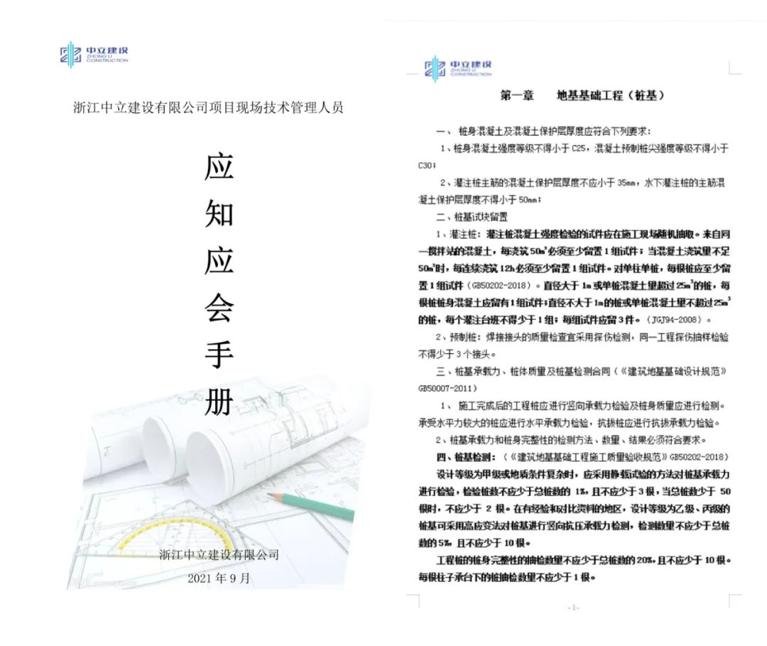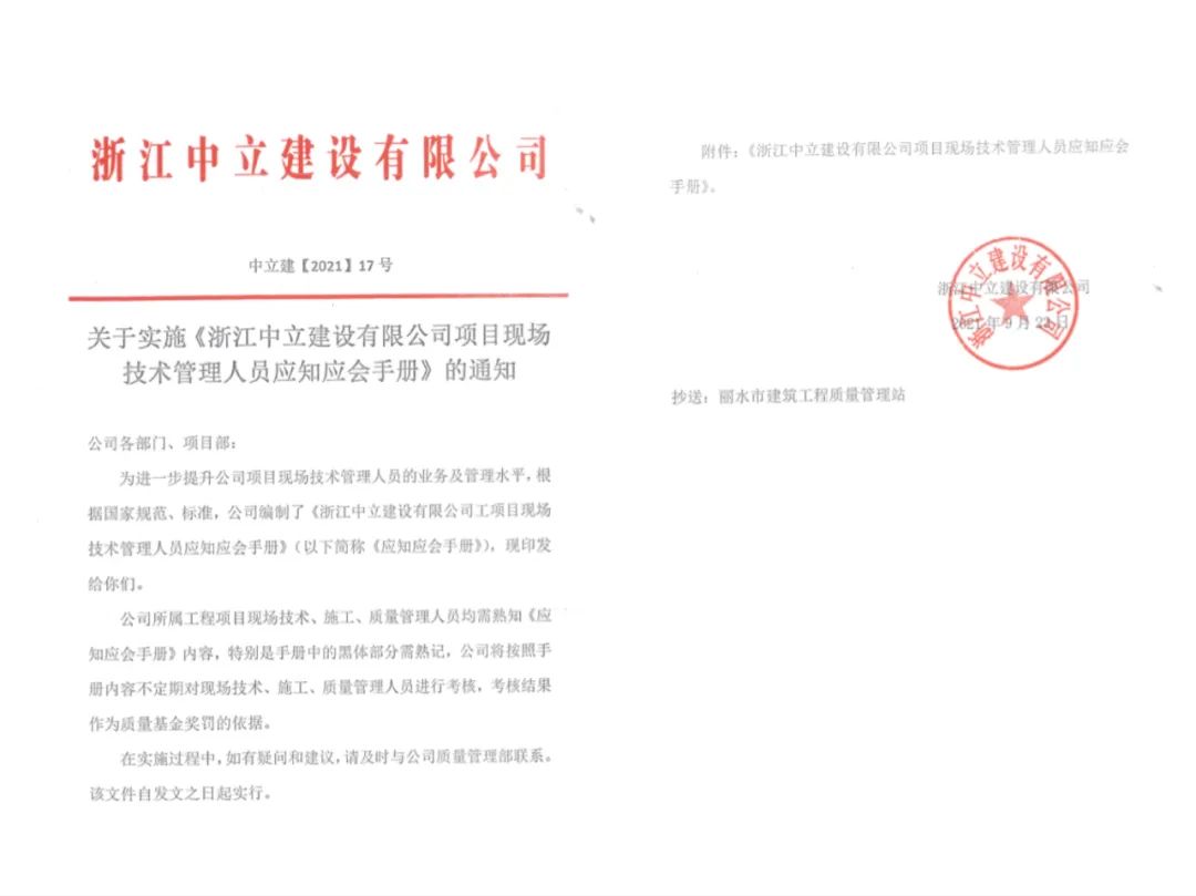 為進一步提升公司項目現場技術管理人員的整體業(yè)務和管理水平,積極開展“質量月”活動,根據國家標準規(guī)范,中立建設編制了《浙江中立建設有限公司工項目現場技術管理人員應知應會手冊》,并于9月23日發(fā)文實施。這是繼今年6月份我公司出臺的《工程質量通病防治(2021試行)》后的又一重要技術性手冊。